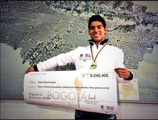 El Instituto de Recreación y Deporte de Bogotá premió al ciclista bogotano con un cheque por más de nueve millones llamada "Estímulo Forjador de Campeones", tras su título mundial en la carrera por puntos. Foto: Vía Twitter @jhonnra