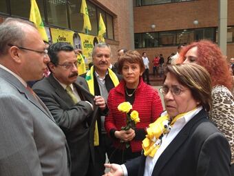 Los militantes de la UP realizan a esta hora una manifestación a las afueras de la Registraduría pidiendo, con flores amarillas en las manos, el cese de la violencia política contra la izquierda
