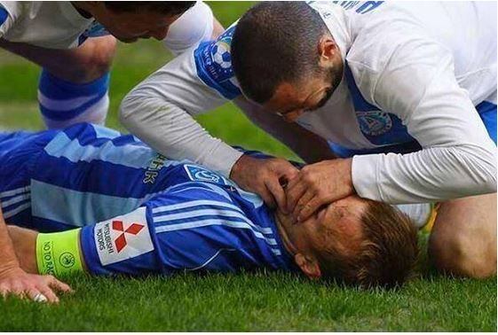 El ucraniano, del Dnipro tan pronto vio que Oleg Gusev cayó inconsciente en el terreno de juego, le abrió la boca y evitó que se mordiera la lengua y se ahogara tras haber recibido un rodillazo en la cara. Su acción le da la vuelta al mundo. Foto @TSBible