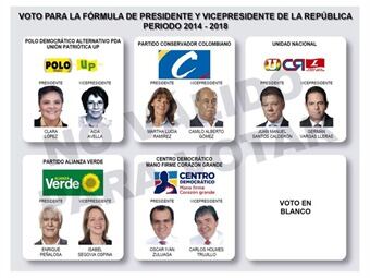 Ya quedó listo el tarjetón electoral para las presidenciales. El sorteo, realizado en el Hotel Tequendama, arrojó el orden de los partidos de la siguiente manera:Polo Democrático con Clara López en primer lugar, seguido del conservatismo con Marta Lucía Ramírez, en tercer lugar Juan Manuel Santos por la Unidad Nacional, en cuarto lugar esta Enrique Peñalosa de la Alianza Verde y en quinto y último lugar está el Centro Democrático con Óscar Iván Zuluaga