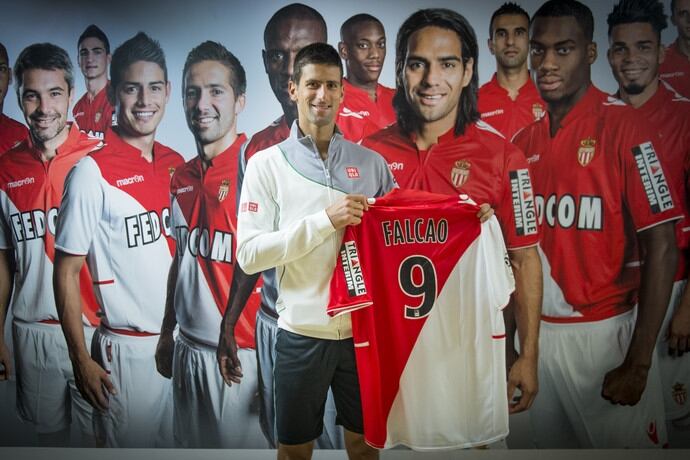 El tenista serbio se entrenó en el estadio Luis II de Mónaco para su debut en el Masters de Montecarlo, donde recibió una atención especial del equipo: La camiseta de Falcao. Foto: Stéphane Senaux, Mónaco Oficial.