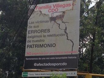 Las familias damnificadas por el desplome de una torre en el conjunto residencial Space en Medellín instalaron una gigantesca valla en la Avenida Las Palmas, en el oriente de Medellín para denunciar sus problemas y pedir a la familia Villegas la restitución de su patrimonio