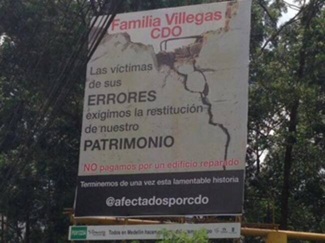 El aviso, instalado entre conocidos establecimientos comerciales Restaurante San Carbón y el Hotel Intercontinental de Medellín, tiene en el fondo una foto de un edificio derruido y agrietado, mientras que en el texto puede leerse: “Familia Villegas CDO. Las víctimas de sus errores exigimos la restitución de nuestro patrimonio. No pagamos por un edificio reparado. Terminemos de una vez esta lamentable historia”