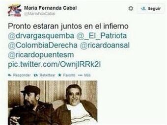 Al lado de otra foto donde se ven sonriendo el escritor y Fidel escribió “Tan comico..le habra contado como ordeno asesinar a Gaitan?Después de recibir cientos de mensajes de rechazo a esas declaraciones la representante María Fernanda Cabal escribió "Jamás cuestionaría la grandeza literaria de Gabo. Eso es indiscutible. Su afinidad con el castrismo sí. Y su indiferencia con Colombia"