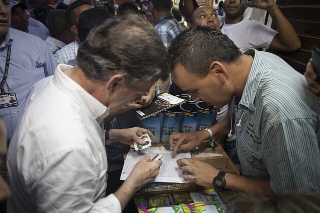 El presidente de la República, Juan Manuel Santos, intercambió caramelos de Panini con un joven durante su visita a Bello, Antioquia.