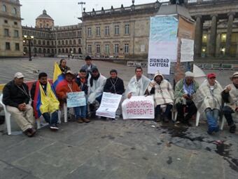 Encadenados amaneció un grupo de campesinos que decidió amarrarse en la Plaza de Bolívar en Bogotá para exigirle al Gobierno del presidente Juan Manuel Santos que cumpla lo pactado