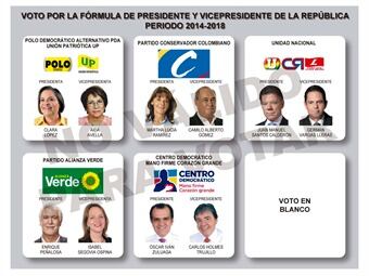Posición 3:Coalición Unidad Nacional conformada por los partidos Liberal Colombiano, Partido Social de Unidad Nacional, Partido de la U y Cambio Radical que inscribió al aspirante a la reelección Juan Manuel Santos Calderón y su fórmula vicepresidencial Germán Vargas Lleras