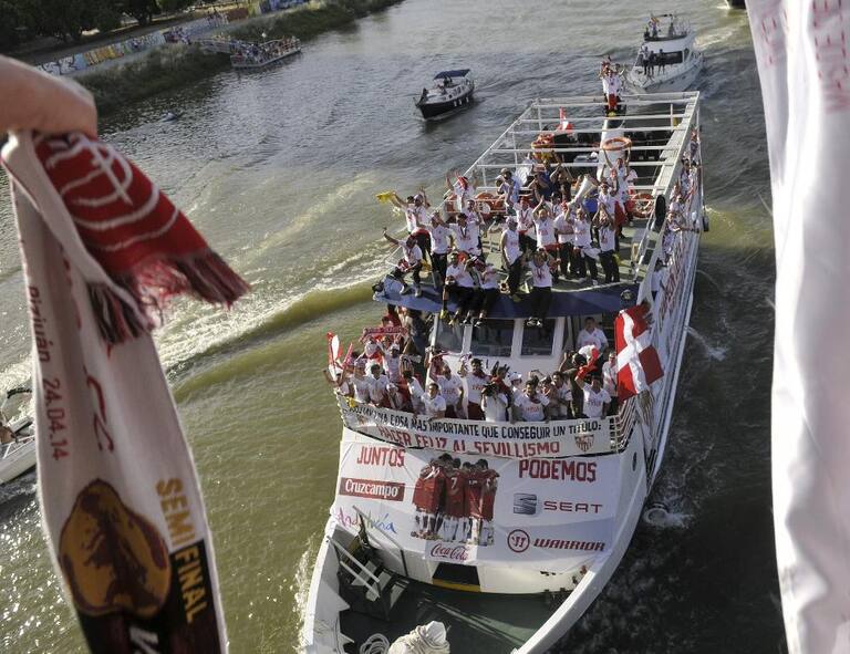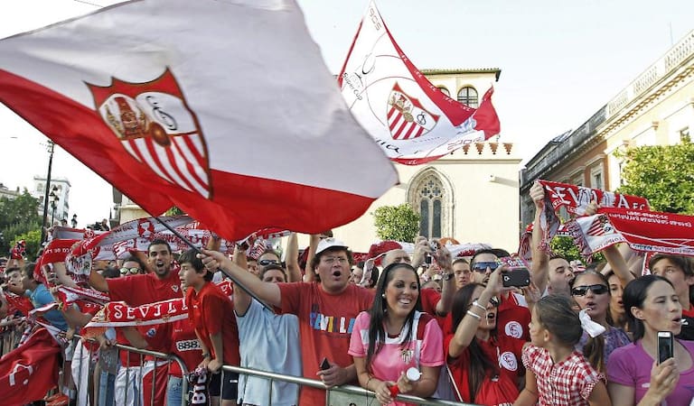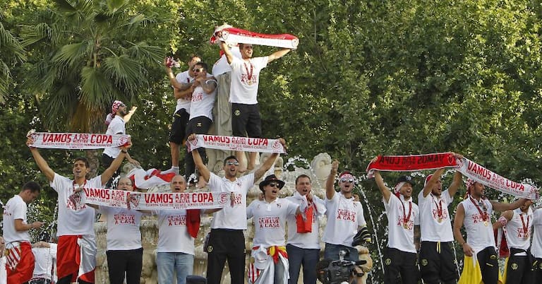 Sevilla, con el colombiano Carlos Bacca, que derrotó al Benfica y se coronó campeón de Europa por tercera vez, llegó a su ciudad y prendió la celebración con sus hinchas.