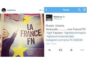 En sus cuentas de Instagram y Twitter publicó una fotografía del diario francés Libération que tiene en la portada a Marine Le Pen, la líder política del Frente Nacional, un partido de extrema derecha que se impuso en las elecciones para el Parlamento Europeo
