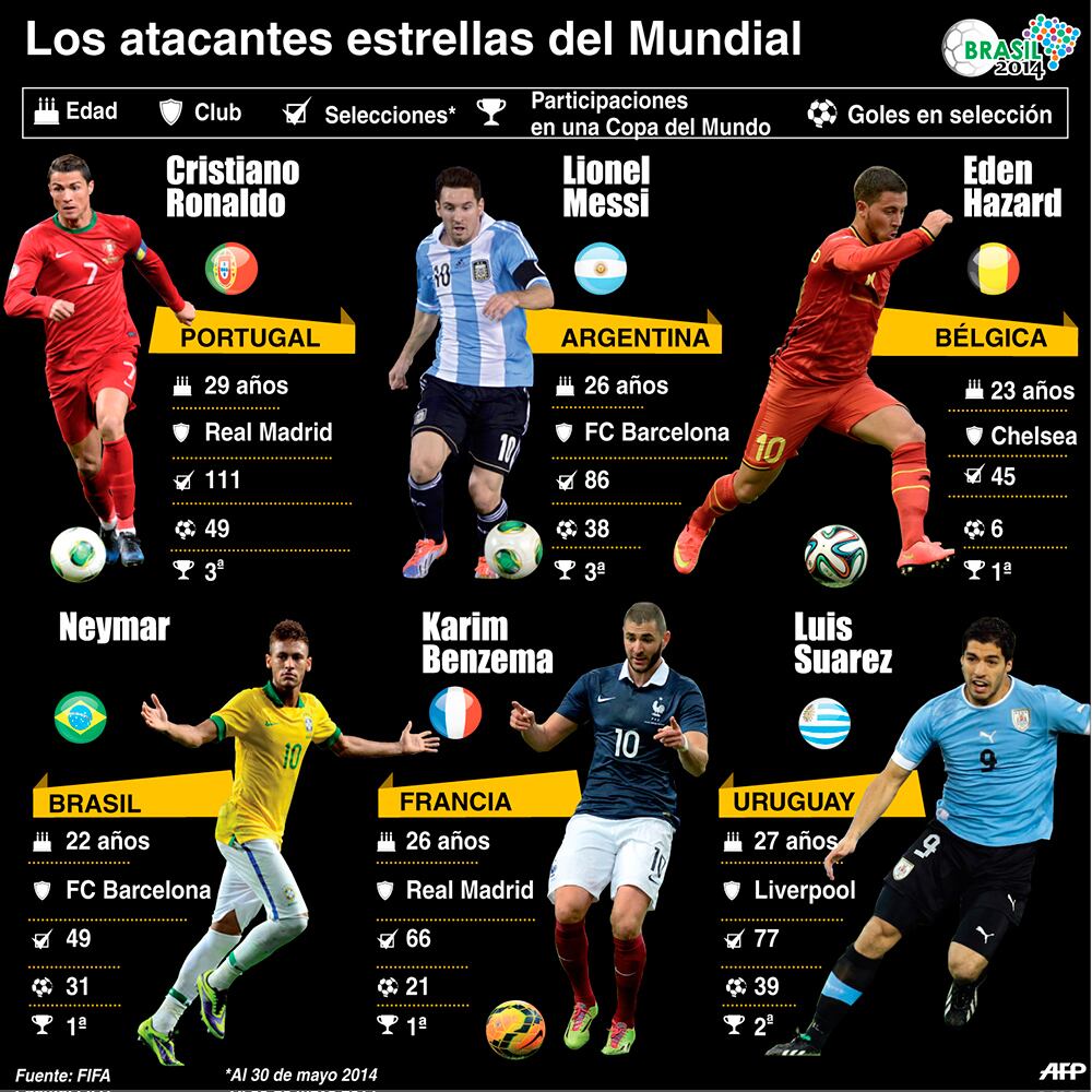 Cristiano Ronaldo, Lionel Messi, Eden Hazard, Neymar, Karim Benzema y Luis Suárez son los llamados a romper las redes.