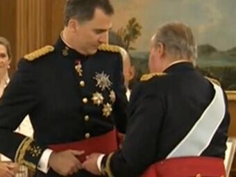 Juan Carlos de Borbón, que ayer abdicó el trono, impuso al nuevo monarca un fajín que le reconoce como capitán general de los tres Ejércitos
