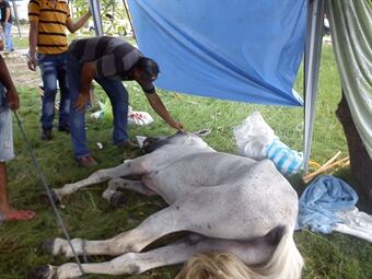 El caballo está siendo atendido por veterinarios de la Umata, con apoyo de la fundación Ángeles con Patas y de veterinarios voluntarios que han llegado a la carpa instalada en el sector del Laguito, para el proceso inicial de recuperación