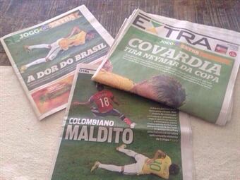 El periódico Extra tituló en primera página “La cobardía saca a Neymar de la Copa” y afirma que la entrada criminal del colombiano lo deja sin jugar por lo menos seis semanas y esperan una decisión de la FIFA por esta acción