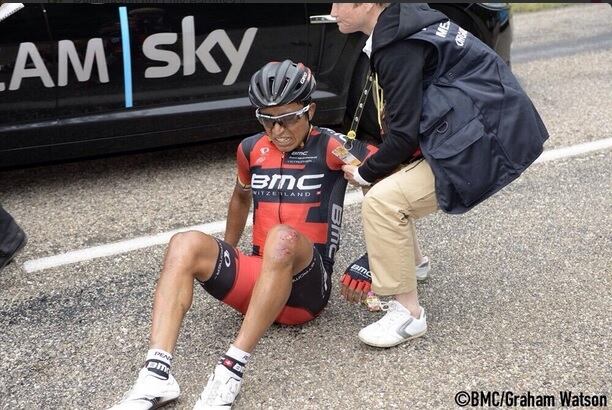 El ciclista colombiano del BMC sufrió una caída sobre el final de la séptima etapa y tuvo que abandonar la carrera. Foto: @BMCProTeam