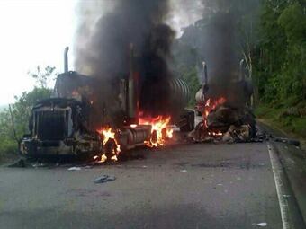 Cinco camiones cisterna dedicados al transporte de crudo desde los pozos del departamento del Putumayo fueron incinerados por la guerrilla de las Farc en la carretera entre Mocoa y Pitalito