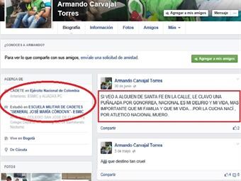 Luego de conocer las declaraciones por Facebook de quien sería un cadete del Ejército, que supuestamente promovía violencia entre hinchas de los equipos de fútbol, el cadete identificado como Armando Carvajal Torres aseguró que fue víctima del hakeo de su cuenta, por tanto lo dicho en los comentarios de la red social no son suyos, sino de quien presuntamente quiere afectarlo