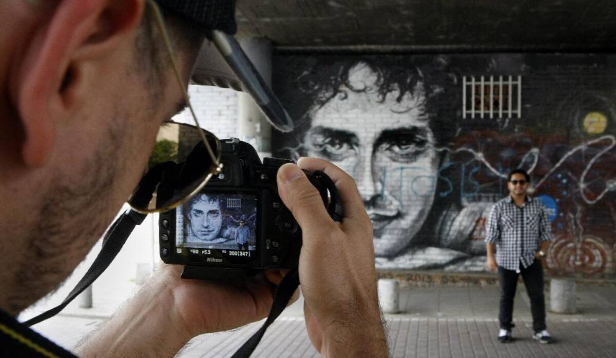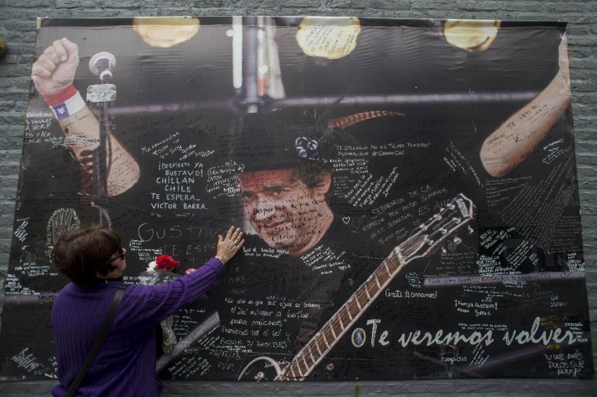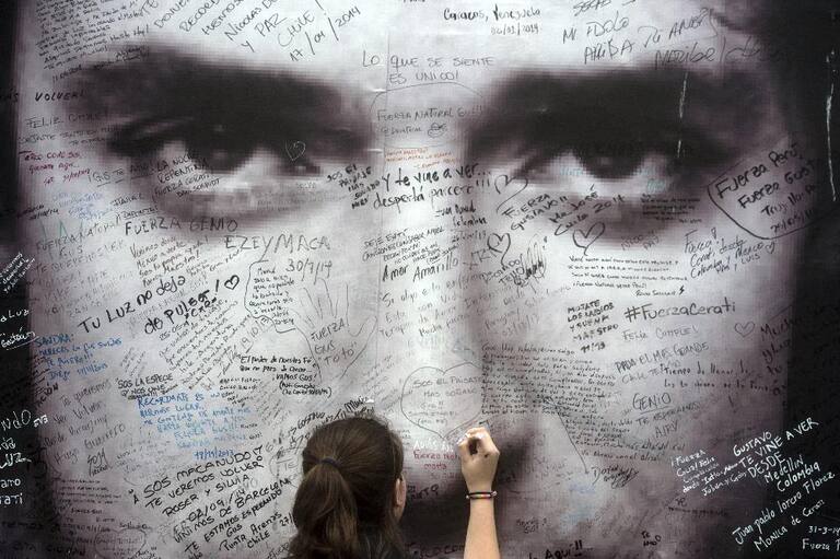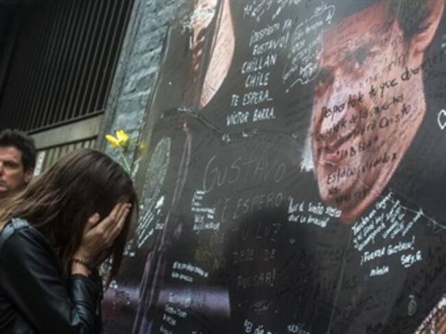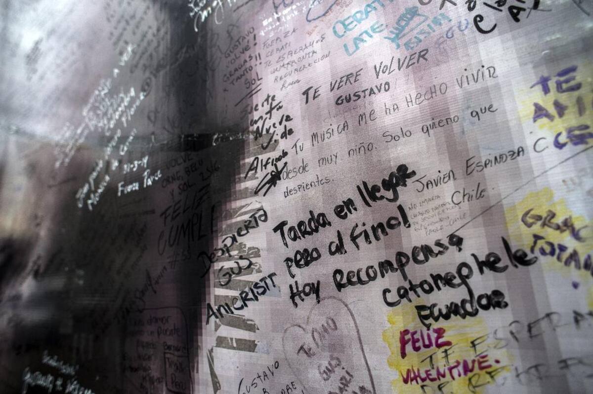 Los seguidores del músico escriben mensajes en un cartel con su imagen manifestando su dolor frente a la muerte del artista.