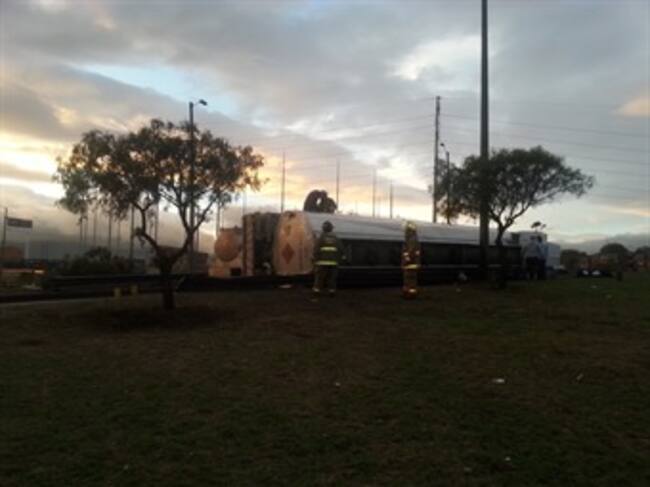 El accidente se presentó hacia las tres de la mañana, al parecer, por fallas mecánicas, en la glorieta que queda justo al frente de la estación de Banderas de Transmilenio un carrotanque se volcó con 12.000 galones de combustible
