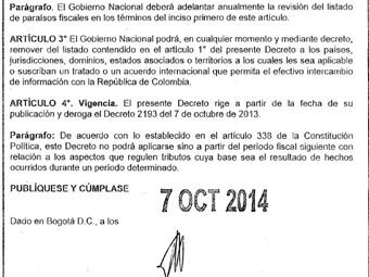 El decreto 1966 del 7 de octubre de 2014, donde Colombia fija la lista de 41 territorios a los que considera paraíso fiscal, y toma decisiones frente a los mismos, señala en el artículo 4 que su vigencia empieza a contar a partir de su publicación