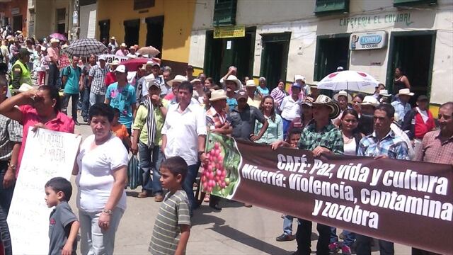 Unas mil 500 personas se movilizaron este fin de semana en el suroeste antioqueño para expresar la inconformidad por una concesión que fue otorgada a una multinacional para la explotación de minerales en 5.400 hectáreas. De esta manera, los caficultores rechazaron la decisión del gobierno departamental y argumentaron que la llegada de la minería podría incrementar la violencia y generar un impacto negativo en la producción del grano en esa subregión una de las mayores productoras del país. “Estamos rechazando rotundamente esa concesión que es una amenaza para la caficultura porque cuando llegan las multinacionales pagan unos sueldos muy altos y no somos capaces de competir con ellas, y por lo tanto, se ve amenazada la recolección, entonces sería el exterminio de los cafeteros”, señaló Alonso Suárez, líder de la región. Según los caficultores, la concesión se verían afectadas las familias caficultoras de los municipios de Betulia, Salgar y Concordia. Las movilizaciones continuarán hasta cuando obtengan una respuesta de las autoridades departamentales, ambientales y mineras, a las cuales juzgaron porque “no tuvieron en cuenta las opiniones de los campesinos del suroeste”.