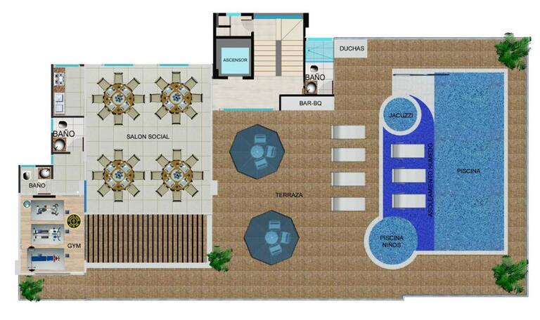 Plano terraza y zonas húmedas.