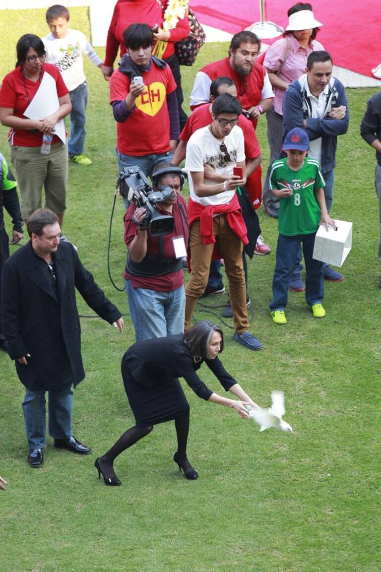 La viuda del comediante Roberto Gómez Bolaños "Chespirito", Florinda Meza , libera una paloma en su homenaje. EFE