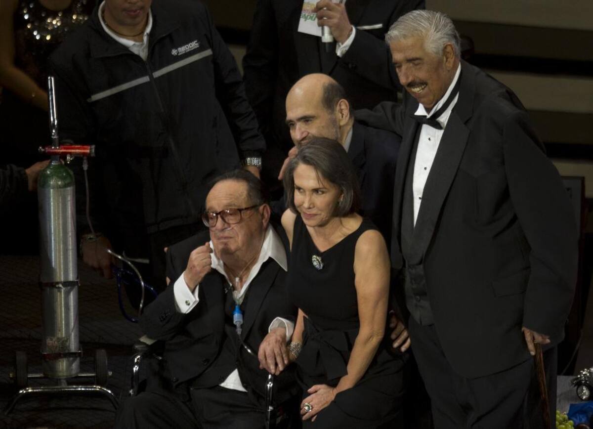 Acompañada de Édgar Vivar y Ruben Aguirre, Florinda posa al lado de Roberto Gómez Bolaños en un homenaje en el Auditorio Nacional de México. AP