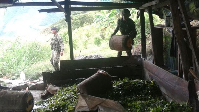 Según el Ejército en el lugar se hallaron insumos líquidos y sólidos representados en: 1035 kilos de hoja de coca, 775 kilos de cemento, 650 galones de base de coca en proceso, 390 galones de gasolina, 325 kilos de cal, 265 galones de gasolina procesada, 75 kilos de urea, entre otros elementos necesarios para la producción del alcaloide
