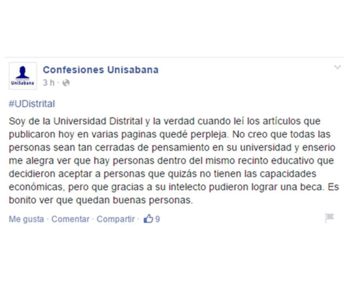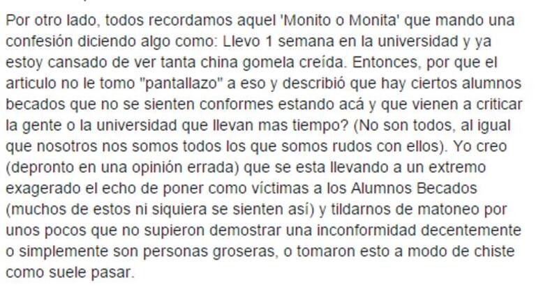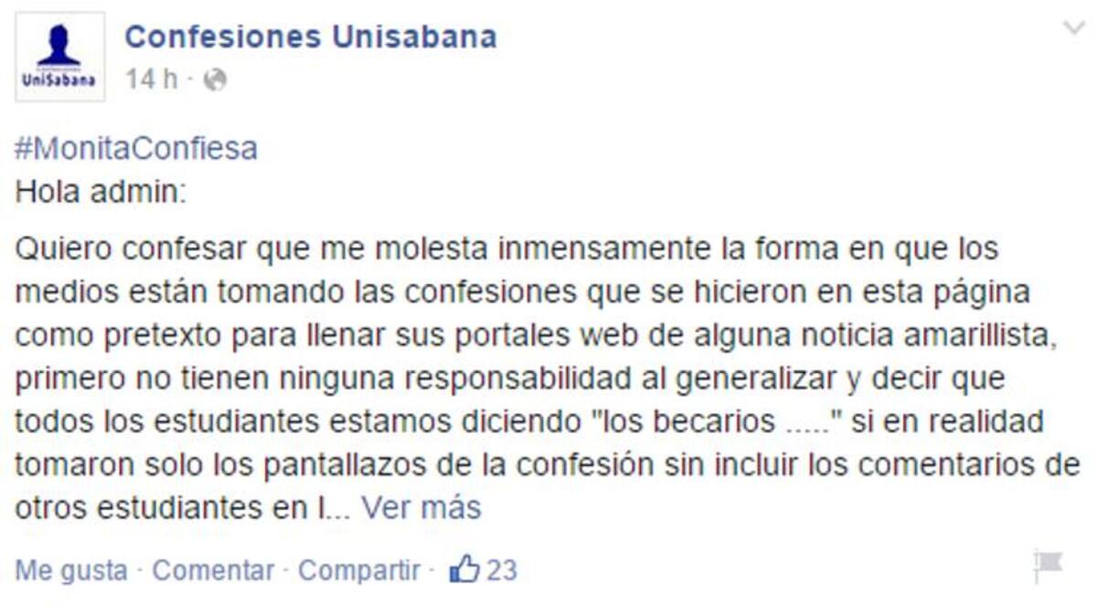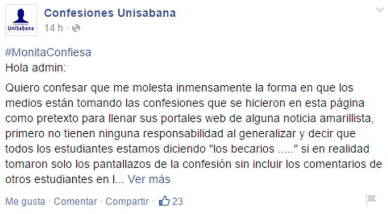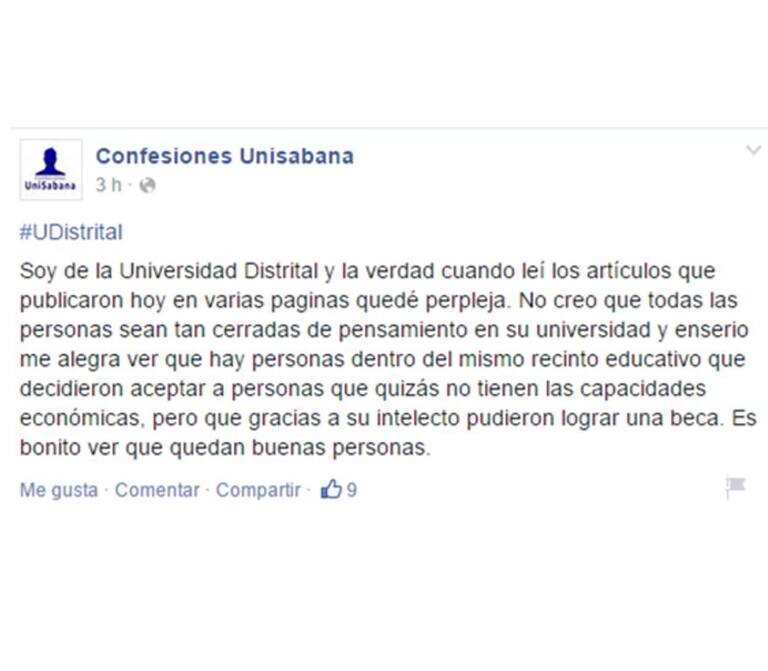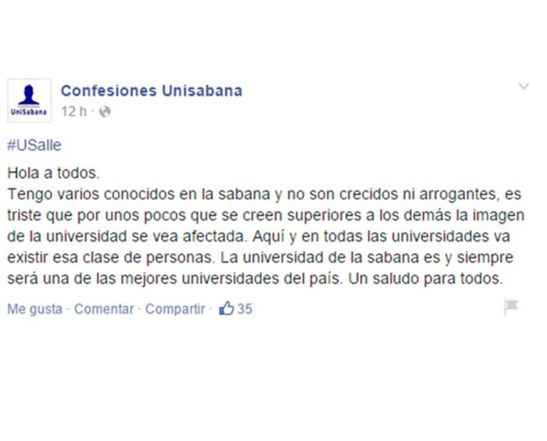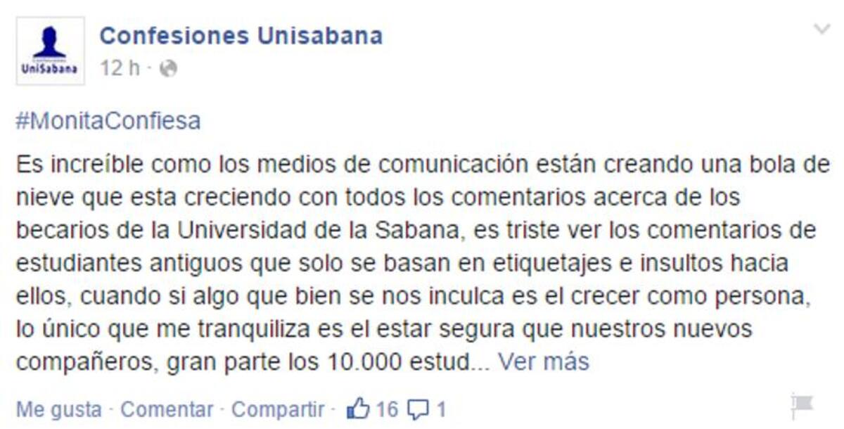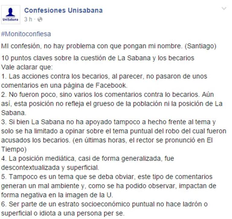 A través del grupo en Facebook Confesiones Unisabana, de donde salieron algunos de los comentarios en contra de los becados, otros estudiantes insisten en que no hay que generalizar y que los mensajes discriminatorios los ha escrito una minoría que no los representa.