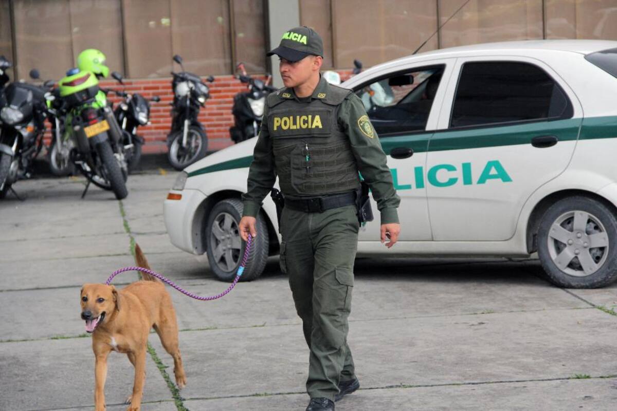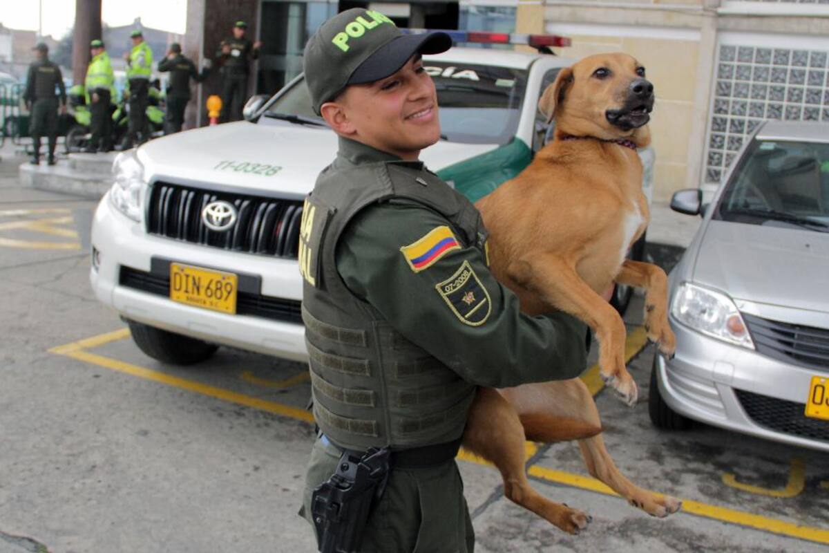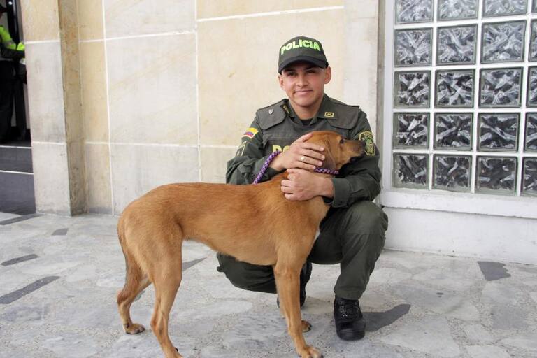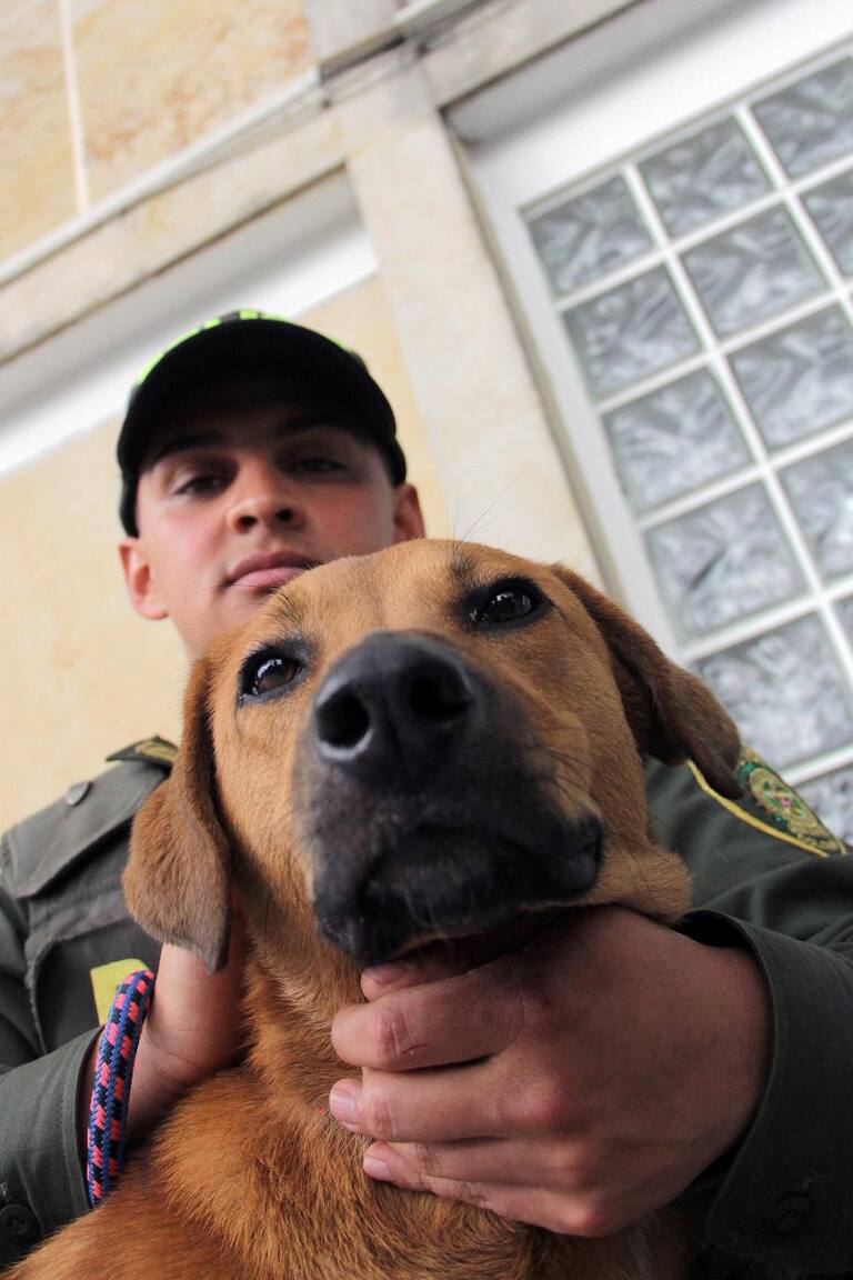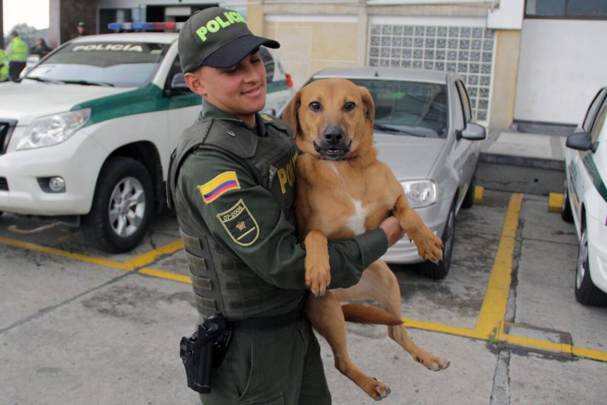 El patrullero rescató a una perrita a la que unos sujetos habían arrojado atada de las patas traseras a las aguas de un humedal en Bogotá.