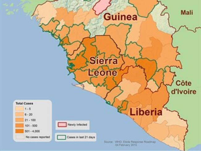 Dentro de los 303 casos, 54 fueron afectados en Guinea, 136 en Liberia y 113 en Sierra Leona