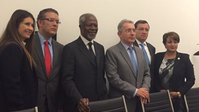 Durante una hora el exsecretario general de la ONU, Kofi Annan, estuvo reunido con el expresidente y hoy senador, Álvaro Uribe, para hablar sobre el proceso de paz que se adelanta con las Farc en Cuba. El congresista Uribe aceptó una solicitud de reunión que el mismo Annan pidió, para escuchar las inquietudes que el exjefe de Estado viene expresando sobre lo pactado con la guerrilla en La Habana