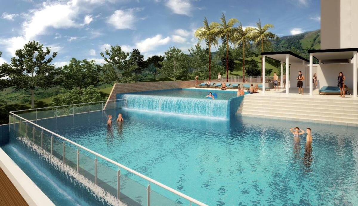 Gran zona de piscinas unidas por una cascada y plazoleta de juegos en piso quinto.