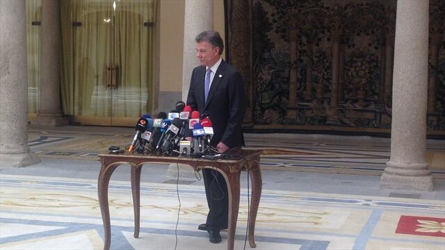 Al término de un encuentro con el rey de España, Felipe VI, el jefe de Estado colombiano, Juan Manuel Santos, explicó los detalles de su visita y enfatizó en que la paz es uno de los temas más importantes que tratará en su estancia. Luego de resaltar las relaciones bilaterales y el buen momento que pasa el comercio internacional entre las 2 naciones, el presidente Juan Manuel Santos explicó la relevancia que tiene el ‘Foro por la Paz en Colombia” y lo que representa para los diálogos con las Farc. Según explicó, “vamos a explicar a España y al mundo lo que hemos hecho hasta ahora y lo que está por venir”. “Es una oportunidad para explicarle a los Europeos hacia donde vamos en el Proceso de Paz”, señaló el presidente Santos. El mandatario realizará su presentación el próximo lunes, en un Foro que destacó como “muy importante sobre el tema de la paz”, confirmando que allí participarán importantes empresarios y los asesores internacionales que han venido ayudando en el proceso. Se refirió además al tema de la Visa Schengen que calificó como “un requisito antipático”, donde afirma que gracias a la contribución del Gobierno español, se eliminará este mismo año, si todo resulta de acuerdo con lo proyectado. Agradeció el respaldo de España y el liderazgo que ha tenido en la región para promover el tema de la paz en Colombia.