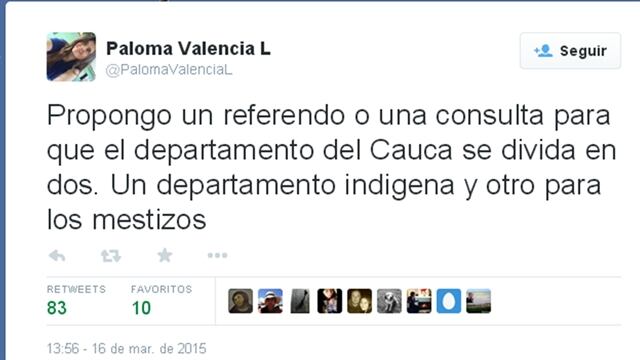 La caucana sugirió desde su cuenta de twitter dividir su departamento; uno para los indígenas y otro para los mestizos.