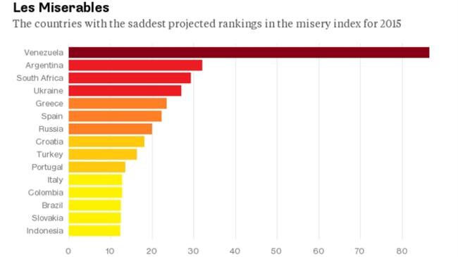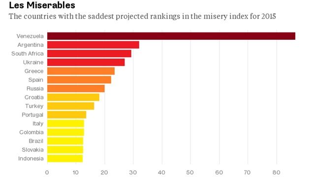 Según Bloomberg, esta clasificación mide la miseria como resultado de una ecuación que suma la tasa de desempleo con el cambio del Índice de Precios al Consumidor (IPC).El ránking lo encabeza Venezuela, seguida de Argentina, Sudáfrica, Ucrania y Grecia. Colombia ocupa el luga número 12 por encima de Brasil, Eslovaquia e Indonesia