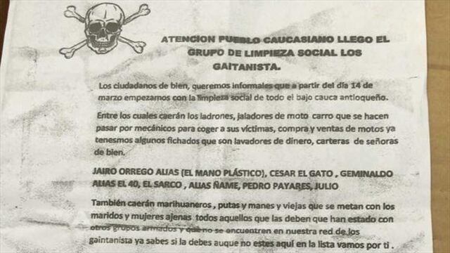 En el libelo se advierte a la comunidad de Caucasia, que desde el pasado 14 de marzo comenzó un plan de limpieza social en el que “caerán ladrones, jaladores de motos y carros, y compraventas de vehículos que operan como lavadores de dinero”