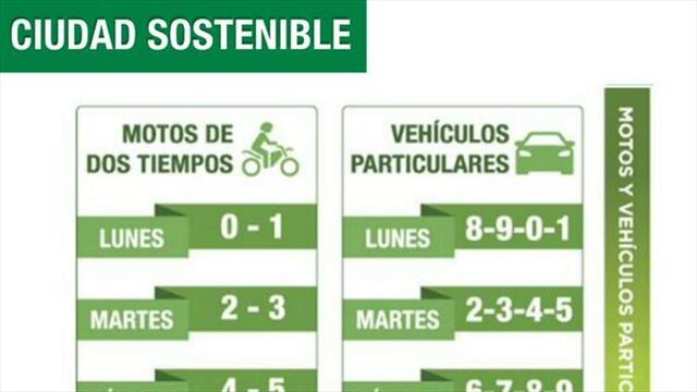Los horario en los que será implementada la medida corresponden a los que habitualmente se viene aplicando en la ciudad 7 a 8:30 de la mañana y de 5:30 de la tarde a 7 de la noche, de lunes a viernes para vehículos particulares y motos de dos tiempos