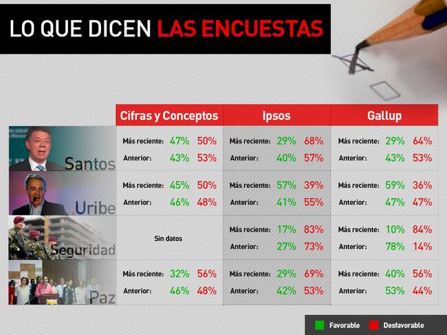 La imagen del presidente Santos, el apoyo al proceso de paz y el uribismo, temas centrales de las encuestas.