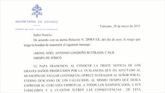 El Pontífice también pide a las autoridades del país, la región y el municipio de Salgar toda la atención para los afectados por la dolorosa tragedia ocurrida el lunes, 18 de mayo.--.-