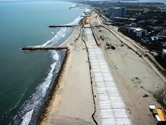 Por medio de un comunicado informan que las obras de protección costera avanzan en un 92% y que se construyeron siete espolones con los que se incorporarán 35 hectáreas de playa y que las obras que quedan por realizar protegerán este sector de la ciudad de catástrofes climáticas