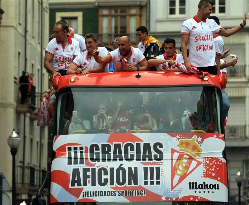Jugadores y cuerpo técnico del Sporting recorrieron las calles de Gijón en un autobús descapotable, celebrando su ascenso a primera división. Foto: EFE