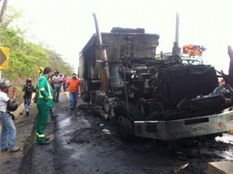 En el choque entre un tracto camión y una motocicleta, dejó ambos vehículos incinerados.