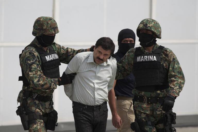 Joaquín 'El Chapo' Guzmán es escoltado a un helicóptero con las manos esposadas, tras su captura en febrero de 2014.