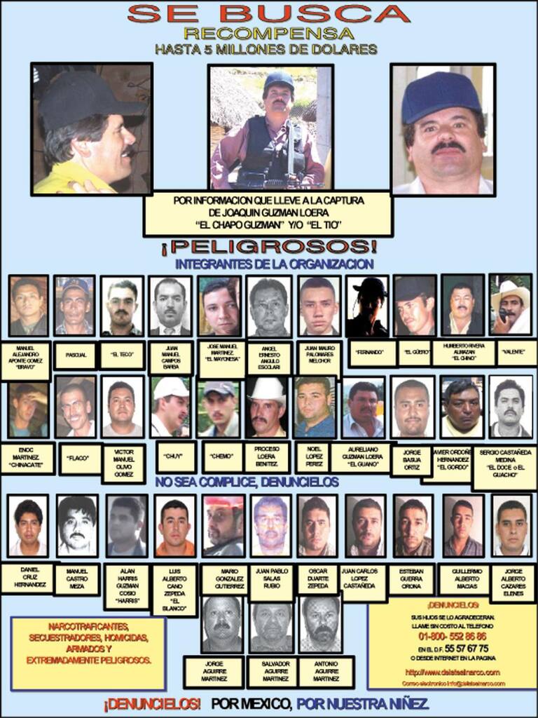 Un cartel del sitio web www.delatealnarco.com ofrece una 5 millones de dólares de recompensa por información que conduzca a Joaquín "El Chapo" Guzmán en marzo de 2005.
