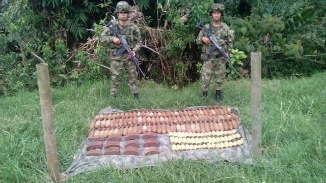 Gracias a la información suministrada por desmovilizados, la Fuerza de Tarea Zeus del Ejército dio cuenta del hallazgo de una caleta que contenía 170 artefactos explosivos pertenecientes a la columna Héroes de Marquetalia de las Farc