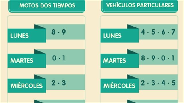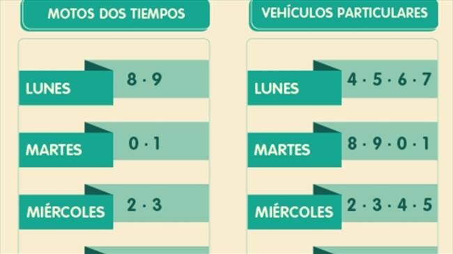 Para el segundo semestre de este año, el pico y placa queda asíVehículos particulares:Lunes: 4-5-6-7Martes: 8-9-0-1Miércoles: 2-3-4-5Jueves: 6-7-8-9Viernes: 0-1-2-3Motos:Lunes: 8-9Martes: 0-1Miércoles: 2-3Jueves: 4-5Viernes: 6-7-.-