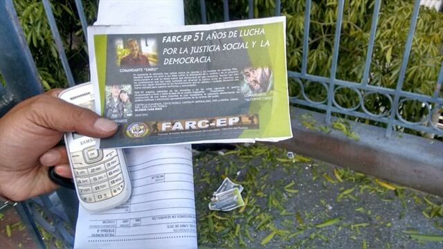 El coronel Javier Parra, comandante operativo de la Policía Metropolitana, informó que los expertos de la Sijín examinan también los volantes hallados en una caja cerca del sitio donde estalló el petardo, con mensajes alusivos a los 51 años de las Farc, del bloque Iván Ríos, en los que aparecen imágenes del desaparecido jefe de las Farc Alfonso Cano y del comandante Emiro