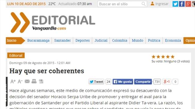 Vanguardia Liberal, periódico bumangués de gran traidición en influencia en el oriente del país anunció que no se lucrará de la publicidad que pague la campaña de Didier Tavera, aspirante liberal a la gobernación de Santander