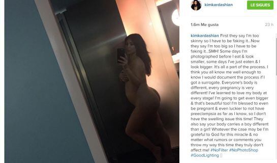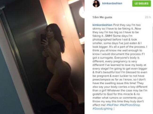 Kim Kardashian decidió publicar en su cuenta de Instagram una fotografía en la que aparece desnuda y embarazada, luego de las críticas que la acusan, incluso, de fingir su embarazo y de haber recurrido a alquilar un vientre.